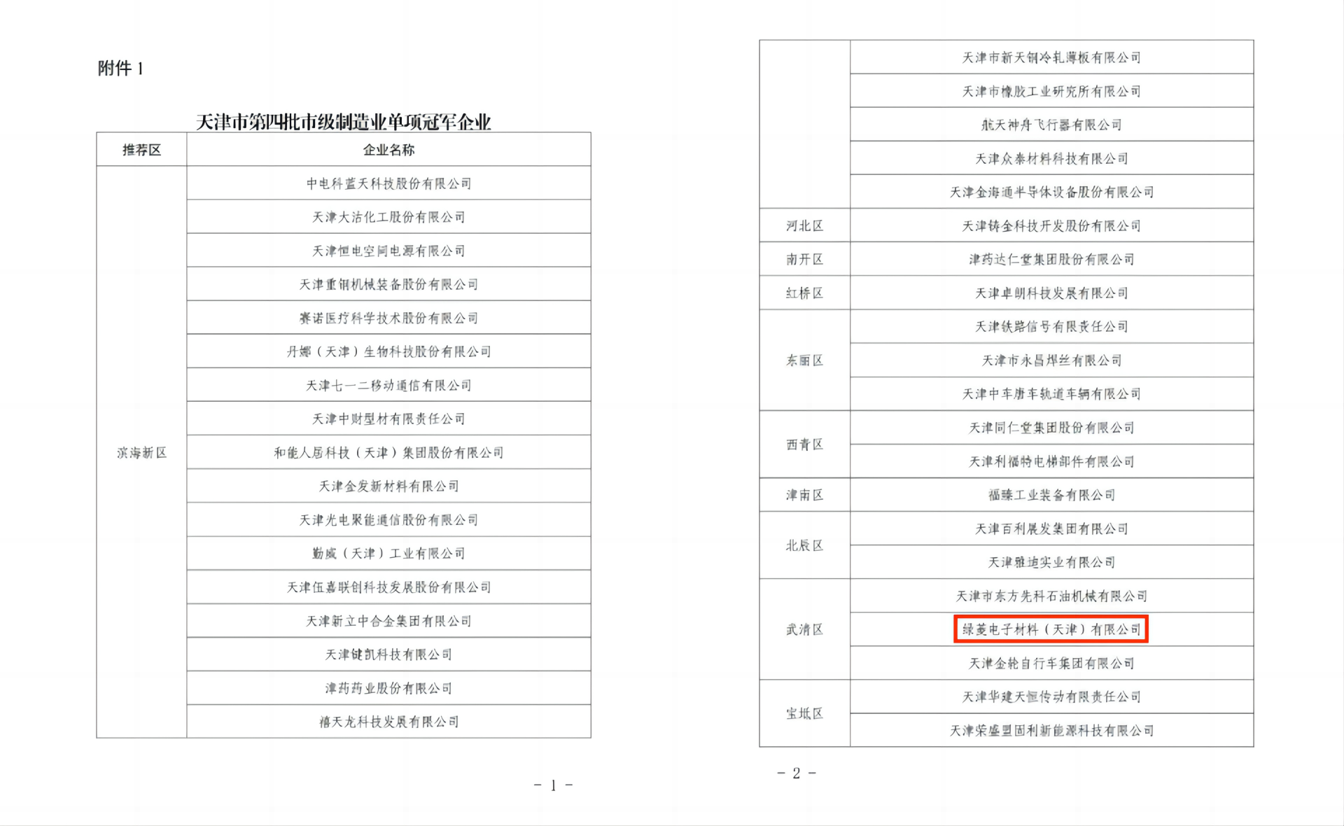 近日,天津市工業和信息化局公布了天津市第四批市級制造業單項冠軍企業名單,綠菱電子材料(天津)有限公司經過審核,被認定為“天津市制造業單項冠軍企業”。
