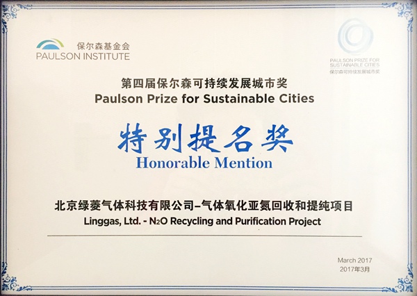 保爾森基金會主辦的第四屆保爾森可持續發展城市獎3月16日在京舉辦頒獎典禮,北京綠菱氣體科技有限公司在山東菏澤開展的“氧化亞氮回收和提純項目” 在參加評選的42個項目中脫穎而出,榮獲本屆“特別提名獎”。評委代表、美國內政部前副部長、大自然保護協會公共政策全球董事總經理琳·斯嘉麗(Lynn Scarlett)女士向綠菱公司董事長趙冰先生頒發了獎狀,保爾森基金會主席亨利·保爾森(Henry M. Paulson, Jr.)向趙冰先生表示祝賀并合影留念。